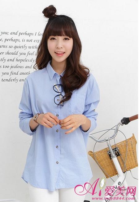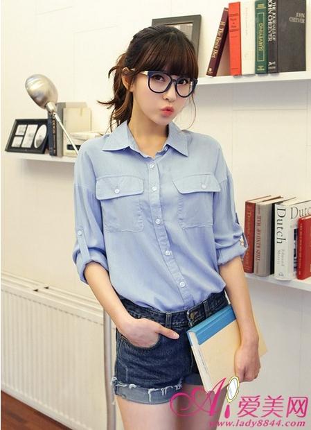淡蓝色棉质衬衫,休闲味十足,搭配牛仔热裤,时尚俏丽。