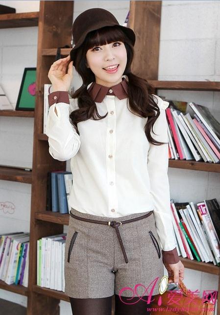 白色衬衫撞咖啡色领子与袖口,带有浓浓的复古风情,搭配一条粗花呢的短裤,是很抢眼的春日装扮。