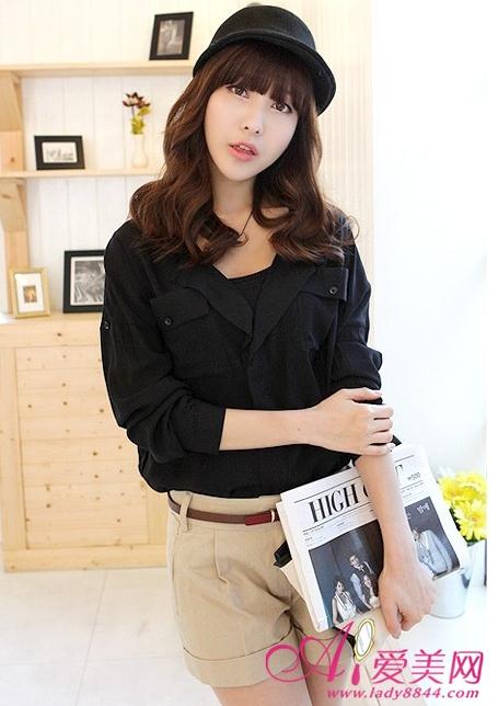 黑色休闲衬衫,时尚又百搭,卡其色短裤与圆顶小帽都是它不错的搭配单品。
