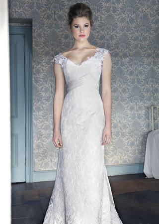 精致的蕾丝让丝缎的婚纱充满细腻的女人味;腰部独具匠心的层叠设计,通过纤细的腰部将胸线烘托得饱满;A型轮廓将体态娇小的新娘塑造得玲珑有致。