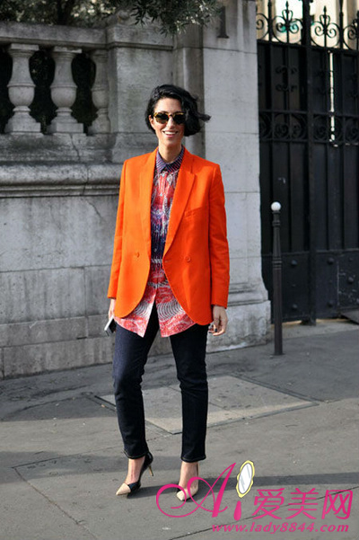荧光色西装配上印花衬衫很抢眼。紧身裤加尖头鞋很显腿细。有街头艺术家的感觉。