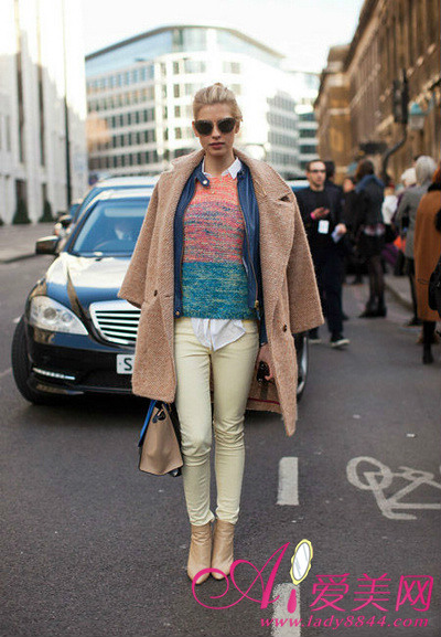 擅长混搭的一枚,层次穿法很显气场。白裤子配裸色尖头靴,简洁不失韵味。