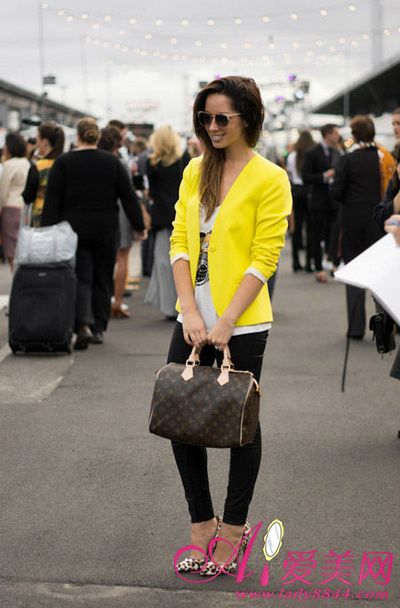 亮黄色外套很有重点,内衬卡通T恤很年轻俏皮呢!LV包包和豹纹尖头鞋显露出高贵品味。年轻不失高雅的装扮。