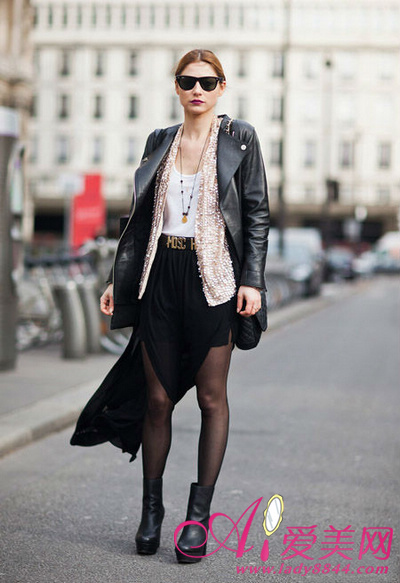 黑色机车皮衣起到保暖作用,加上不规则短裙和皮靴非常有型。里面的钉珠衫好抢眼哦~增添华丽感。