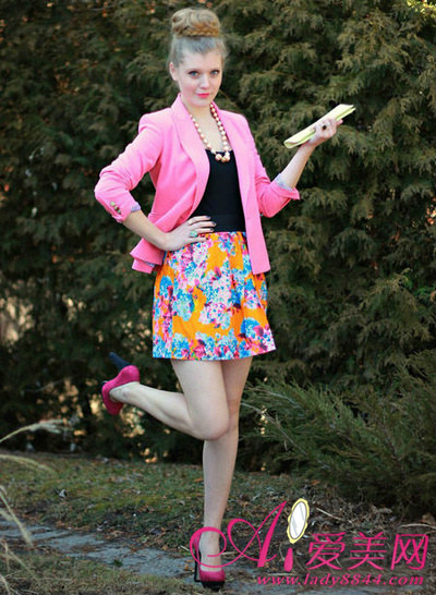 桃红色西装桃红色高跟鞋让肤色看起来像桃花般粉嫩。配上拼接印花连衣裙,宛如糖果般甜美的少女装扮。