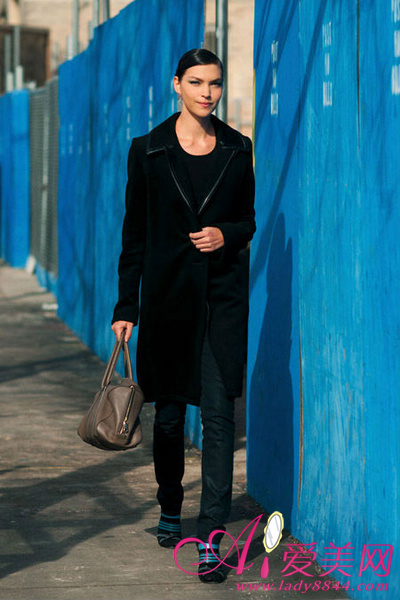 黑色长款外套剪裁很挺身,看起来很端庄很有女强人的气势。脚上的黑蓝色高跟鞋款式很特别。