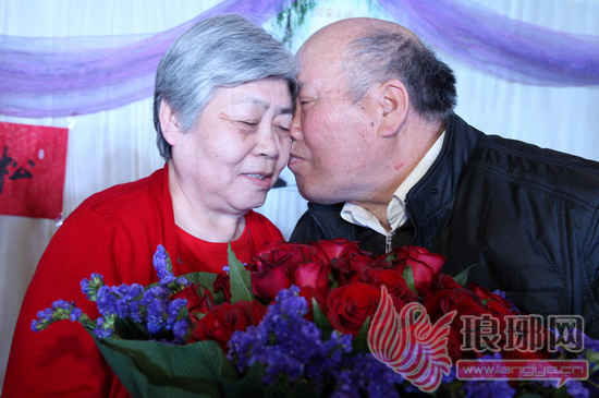 金婚庆典上,秦致民(右)为老伴石有容深深献上一个吻。