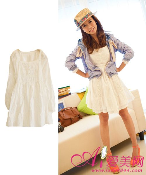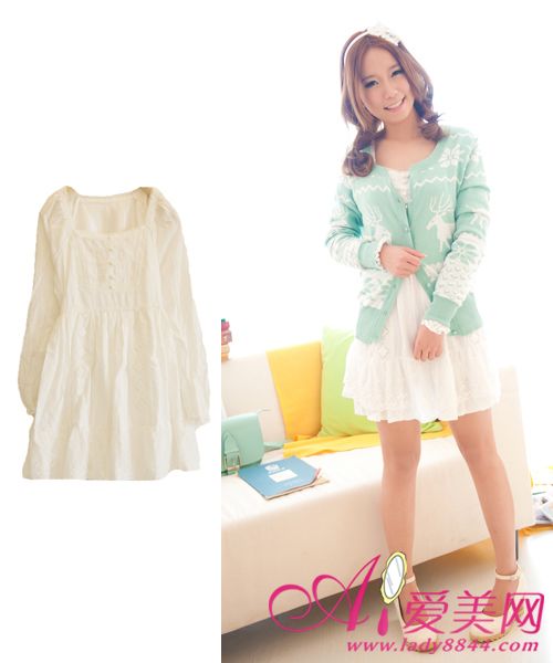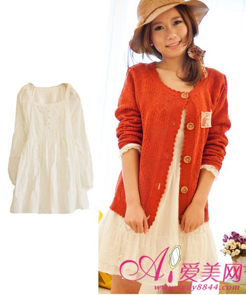 白色蕾丝加棉布束腰层叠连衣裙,搭配一件薄款的勾花针织开衫,甜美大方惹人爱,很适合MM们约会穿喔!