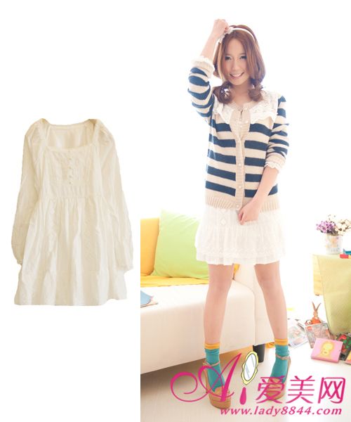 搭配三:蕾丝棉布甜美连衣裙 + 条纹针织开衫