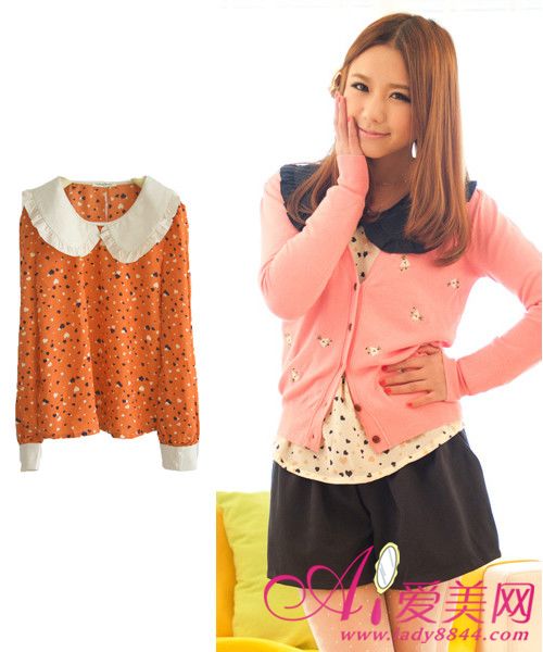 娃娃领雪纺上衣搭配深色休闲短裤,外搭一件针织开衫外套,甜美度轻松提升。