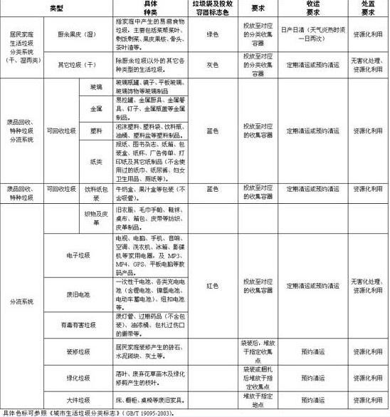 在公共区域,根据垃圾产生量,在每个垃圾投放点配置“厨余果皮”、“其它垃圾”分色投放容器,实现干、湿垃圾分类投放;对于产生频率较低的特种垃圾及废品回收品种,如“有害垃圾”、“玻璃”、“织物及皮革”等选择公共区域设置适量分色投放容器。