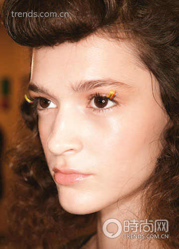 桃粉色渐变的睫毛不但没带来诡异的妆效,反而有了精灵的模样;还有那一簇一簇的下睫毛则让妆容更有张力。