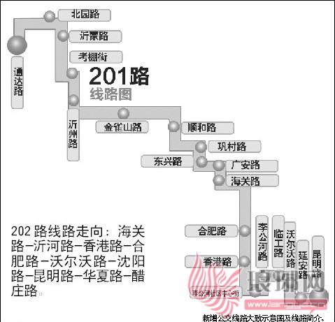 其中,201路全长:22公里,运行时间:6:00-18:30,运营车辆:16台,班次间隔:10分钟。线路走向为:通达路-北园路-沂蒙路-考棚街-沂州路-金雀山路-顺和路-巩村路-东兴路-广安路-海关路-合肥路-香港路-李公河社区中心街-李公河路-临工路-沃尔沃路-延安路-昆明路。该线路的开通,解决了经济技术开发区内皇山社区、李公河社区、园丁花园等大型社区及临沂一中南校区不通公交车的问题,减少了临沂经济技术开发区公交盲区,实现了临沂经济技术开发区公交车辆与临沂九县班线客运车辆的对接,方便了临沂一中南北校区广大师生及沿线工厂企业、社区居民的出行。