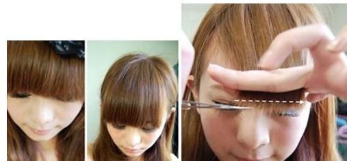 先把刘海梳平顺,然后用食指和中指夹着发梢,沿着直线慢慢的剪过来。切记一定要慢,剪刀要摆平。