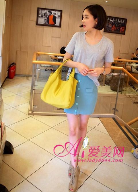 抢眼的复古派撞色搭,成一直线的复古纽扣点缀在做旧感的包臀裙上,水蓝色和暗蓝色完美融合的复古feel,搭配简约的灰色欧美T恤,自然又迷人,荧光黄的单肩包和蓝色裙擦出时尚火花。