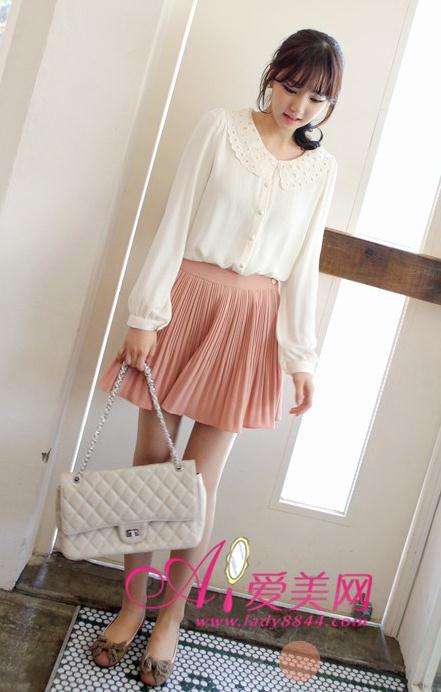 清新派:蕾丝拼接雪纺衫 + 裸粉色百褶裙