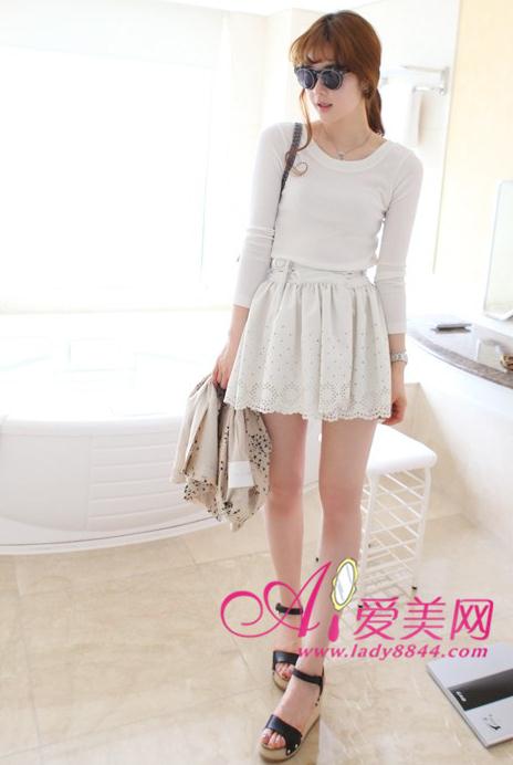 统一的白色搭配,清新怡人的清新feel,蕾丝钩花的精美蓬蓬裙,俏丽可爱,清纯中透着丝丝诱惑,简约的优雅T恤搭配,大方简约却不简单噢,小清新的经典搭配。