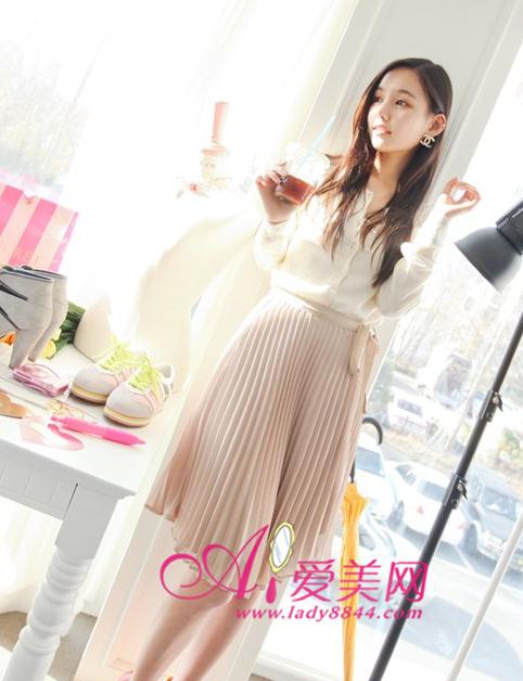 清新派:裸色风琴裙 + 白色简约雪纺衫