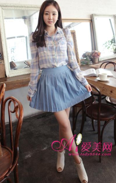 复古派:水蓝色百褶裙 + 粉紫色格子衬衫
