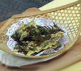 1、将毛峰茶叶用70度的温水泡开,挤干水分,拍干生粉炸酥待用;