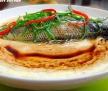 5、热锅添入3汤匙油,爆香姜丝,放入葱段,倒入4汤匙蒸鱼酱油、1/4汤匙白糖还有刚才濞出来的汤汁,拌匀,浇在鱼身上然后撒上香菜末。即可,就着烙饼吃就更棒了。