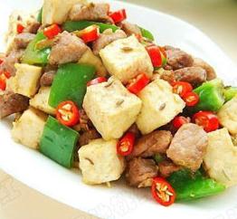 主料:羊肉200克、豆腐200克、青椒1个\孜然1小勺、白糖、姜丝、葱花