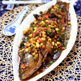 1、鱼去内鳞及内脏后洗净抹干,在鱼身两边各划四道,抹上1小勺盐略腌15分钟