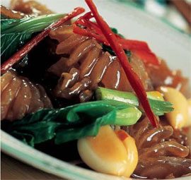2、往锅里倒油,烧热,放葱、辣椒、大蒜爆香,再放入牛筋、味精、糖、酒、番茄酱、盐、水,用3、小火焖煮40 分钟,然后夹出葱、辣椒、蒜,用水淀粉勾芡,淋上香油炒匀即可