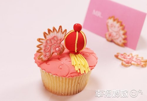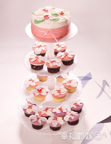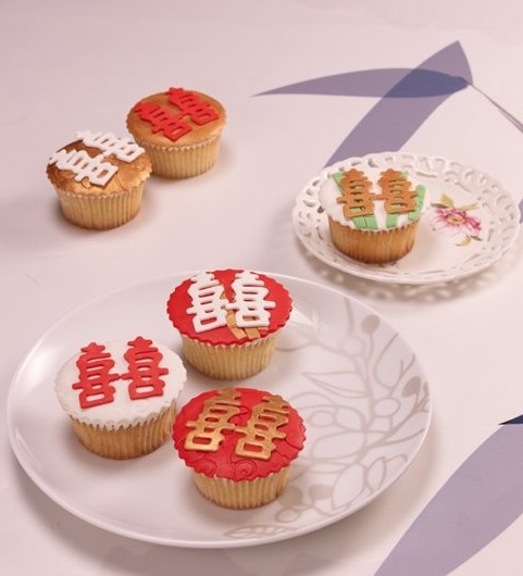 新中式蛋糕既能表达喜庆民俗的风貌,又不能失去蛋糕本身应有的可口外观。所以较多使用了中式图案元素,如传统喜字、写意茶具、旗袍盘扣等点明主题,而在颜色的运用上还是以柔和的粉红、粉绿为主,一款蛋糕上的用色不会超过三种,以清新的色调诱人食欲。另外,还用兰花、梅花等有中国传统特色的花卉作为装饰元素,以此契合婚礼应有的甜美氛围。
