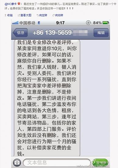 “给了卖家一个中评,结果收到了骚扰电话,并且收到这样一个短信!”网友“NC摩卡”在微博上说,她在一家卖鞋的网店购物后,给了中评并详述了原因,但此后却接到一条短信。对方自称是“专业修改中差评师”,受到该卖家雇佣,专门与“NC摩卡”沟通让其删掉留下的“中评”。