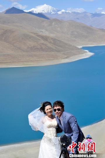 “圣地婚礼”的新人们在羊卓雍错拍摄婚纱照。李林摄