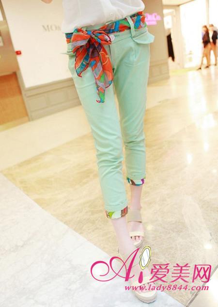 大牌丝带装饰清爽果绿色九分裤,配丝带+美丽的挽边裤,绝对提升你的腿部线条。