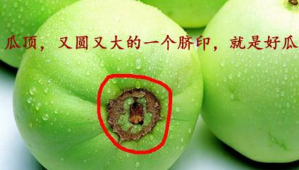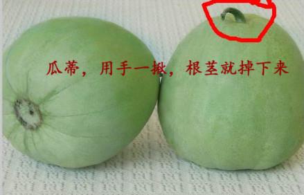 看瓜蒂,用手一揪,根茎就掉下来,留下一个圆圆的坑就是好瓜。所谓瓜熟蒂落就是这个道理;看瓜顶,又圆又大的一个脐印,就是好瓜,要是这个瓜顶脐印很小,就说明瓜还没长开,再大的瓜也不甜;还要看瓜身有没有伤痕,手感是否够脆。如果很软,千万别买,肯定熟过了!
