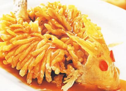 2)、炒锅内放植物油烧至五成热,将鱼块放入炸至金黄色以熟为度,捞起放在碟中如山形;