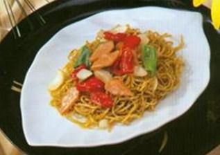 2、锅内放入色拉油升温至8成热时投入面条炸脆后沥去油,倒入卤汁待卤汁吸尽后浇上麻油装入盘内再浇上浇头即可上桌食用。