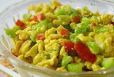 3)锅置于火上,加入油,热后倒入鸡蛋炒熟起出备用,再热余油,放葱、姜末炝锅米炒苦瓜加盐,然后倒和炒好的鸡蛋和苦瓜同炒几下即成。