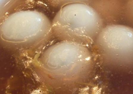 2)藕粉碾碎过筛放入小筐内。再放入馅心滚上一层藕粉,取出装入爪篱中入沸水锅中烫过,再放入小筐滚一层藕粉,依次反复多次,使之成为大的圆子。锅里加清水,下入圆子。煮熟捞入放有糖桂花的原汁汤中,即成。