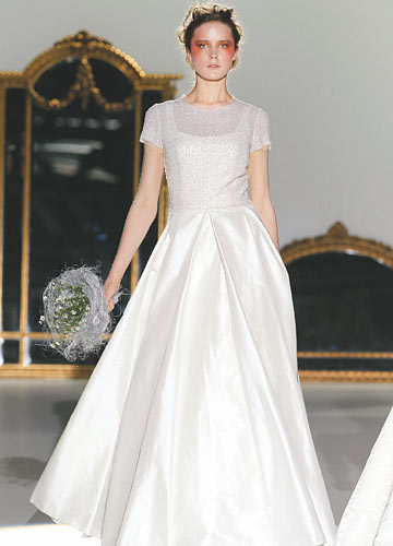 光洁硬挺的亮缎可以轻易塑造华丽廓形,又折射出细腻而温润的光泽,各种风格款型信手捏来,打造简洁大气的经典新娘形象。
