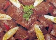 2、将锅置旺火上,放入茶油,烧至八成热,下入狗肉,烹上料酒,再加入调料煸炒后放入清汤,倒入砂煲内,上火煨至狗肉酥烂,拣去桂皮等香料,装入盘中,撒上葱花即成。