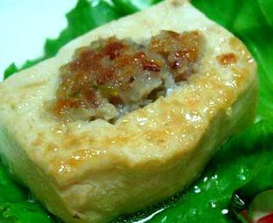 1.豆腐每条切为4小段。将豆腐条挖出约1/3备用。