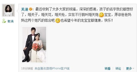 关凌微博证实怀孕待产 幽默智取龙宝宝姓名