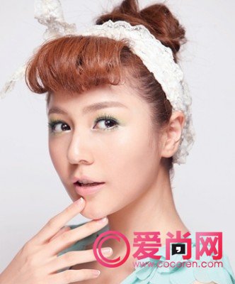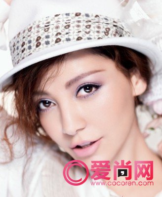 先用紫色打底,再用银粉色眼影与其中和,再取粉色眼影由浅至深,由内眼睑到眼尾处勾画晕染,如果想再活泼一些,就取绿色和黄色眼影,在下眼眶尾处轻轻点染,活泼感立刻十足。