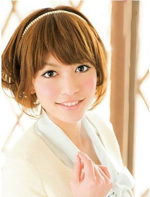刚及眉的斜刘海,脑后勺向内收的碎发,两鬓微垂的散发,看似微有凌乱之感,实则刘海、发尾和两鬓以及头顶的发箍都是一场精心的设计,很有小鸟依人的轻熟女的感觉,甜美感十足。