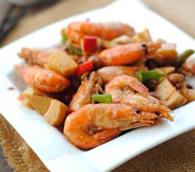 5、炸好的虾备用,笋绰水切丁、青红椒切丁,花生米炒熟备用。