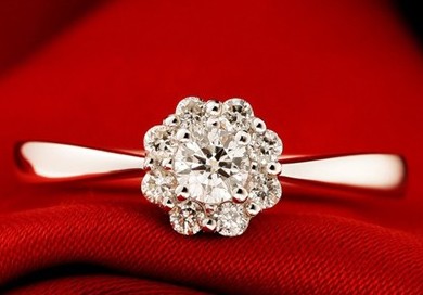 九颗小钻紧紧的围绕住一颗晶莹剔透的大钻,亮丽的光芒相呼应,仿佛众星捧月一般。