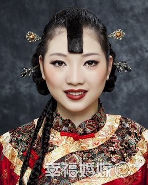 用大辫子取代了长发排,整体以辫子为主,在两侧固定,刘海是整个发型的重点,注意长度要超过头顶亦不可弯曲。