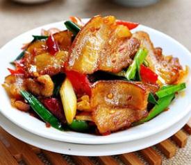 4. 炒锅注油烧热,放入猪肉片炒至出油卷起,加入郫县豆瓣炒上色,再加入甜酱、酱油、青蒜、味精,炒至蒜苗断生即可。