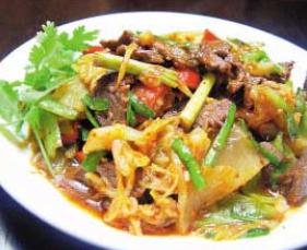 黄牛肉(246克)、泡白菜(1袋、210克)、韭菜(4支)、青辣椒(1只)、红辣椒(1只)、葱(1根)、姜(3片)、蒜(3瓣)。