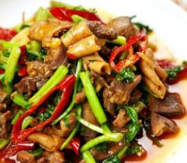1、新鲜鸡杂切小件,鸡心对半切、鸡肝切厚片、鸡胗切片或者切成花刀(将鸡胗突出的一面向上,先斜切,根部不切断,再纵向切,一刀不切断一刀切断)、鸡肠切段,用1汤匙生抽、1茶匙淀粉抓匀稍腌。