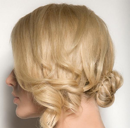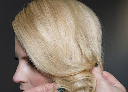 将小马尾拧转成圆形发髻,略微留出一点碎发制造蓬松的效果。